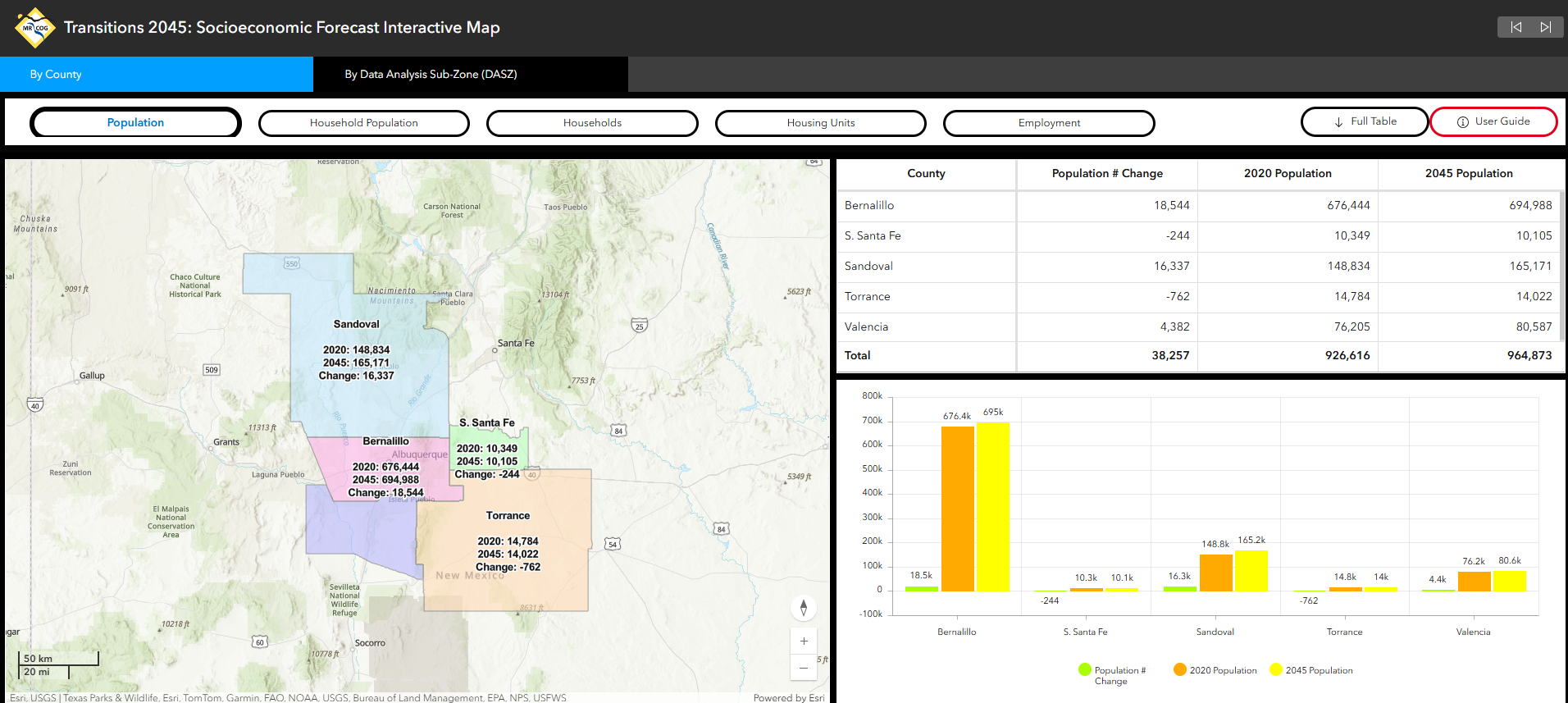 The forecasting process begins with a high-level regional forecast (Bernalillo, Sandoval, Torrance, Valencia, and Southern Santa Fe Counties) for population and employment which is then allocated to small level DASZ forecast.
